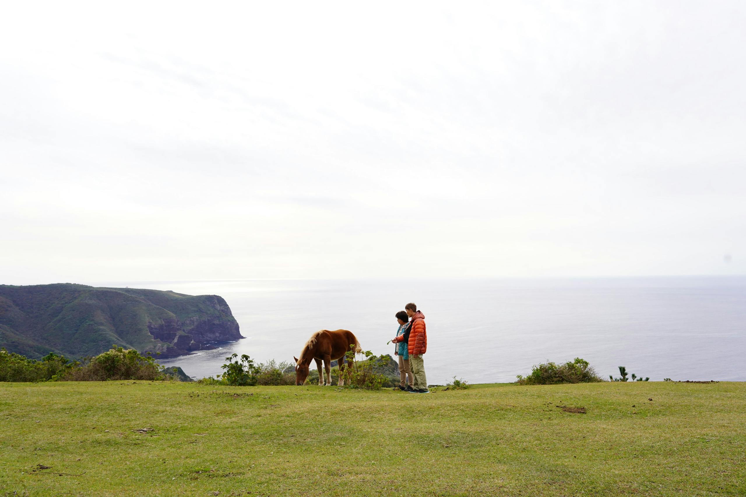 連泊するなら、2日目はお隣の西ノ島へ。巨大なナイフで垂直に切り取ったような海抜257mの大絶壁「摩天崖(まてんがい)」は、海蝕作用によってできた崖では日本有数の高さを誇ります。周辺一帯は放牧地で、牛馬がのんびり草を食む姿が見られます。