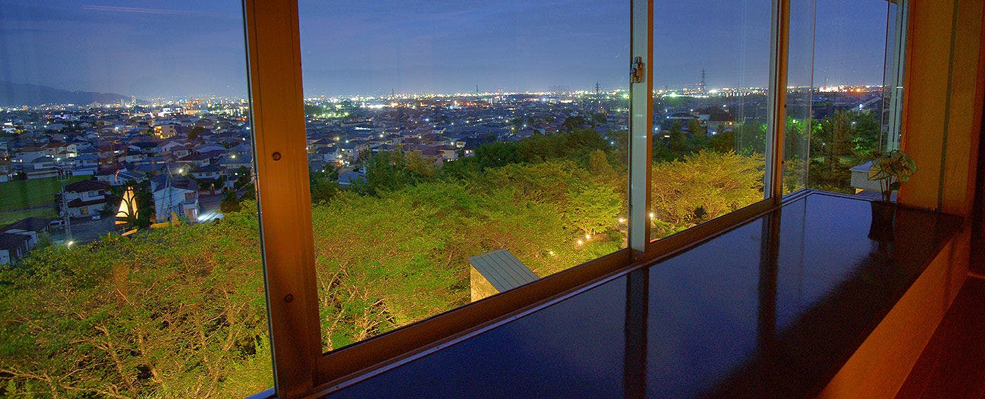 ホテル神の湯温泉の客室からは、甲府盆地の夜景や富士山を望めます。