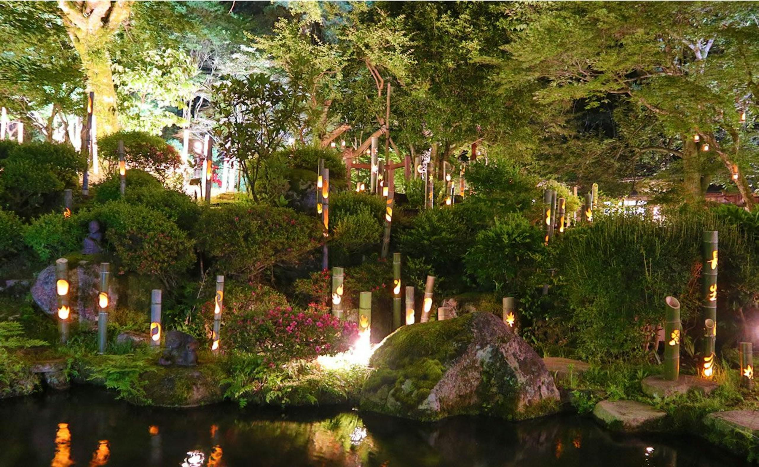 ラジウム泉で体をあたためた後は、浴場から通じるトンネルを抜けて、大庭園露天風呂へ。約3,000坪の庭園は、四季折々、美しい表情を見せてくれます。