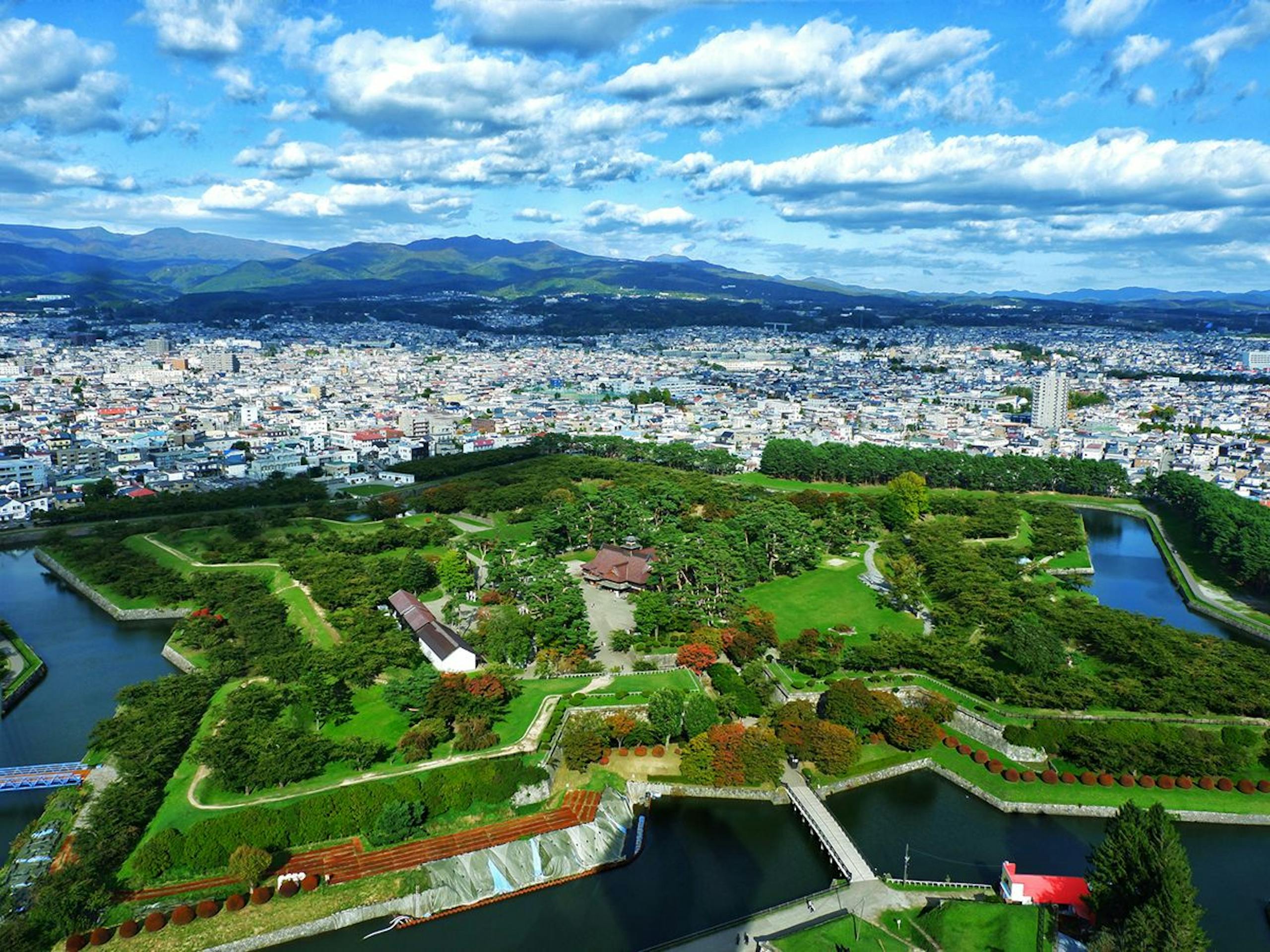 五稜郭は星形のユニークな城郭跡で、日本初の西洋式要塞として知られています。公園内と周辺には約1,500本の桜が植えられており、春には星形の城跡が桜色に染まる絶景が広がります。展望台のある五稜郭タワーからは、五稜郭全体を一望でき、5月・6月は美しい新緑の風景も楽しめます。